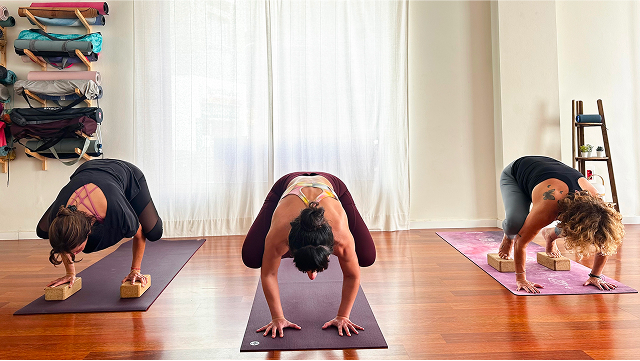 Movimiento consciente y respiración unidas en una práctica fluida.